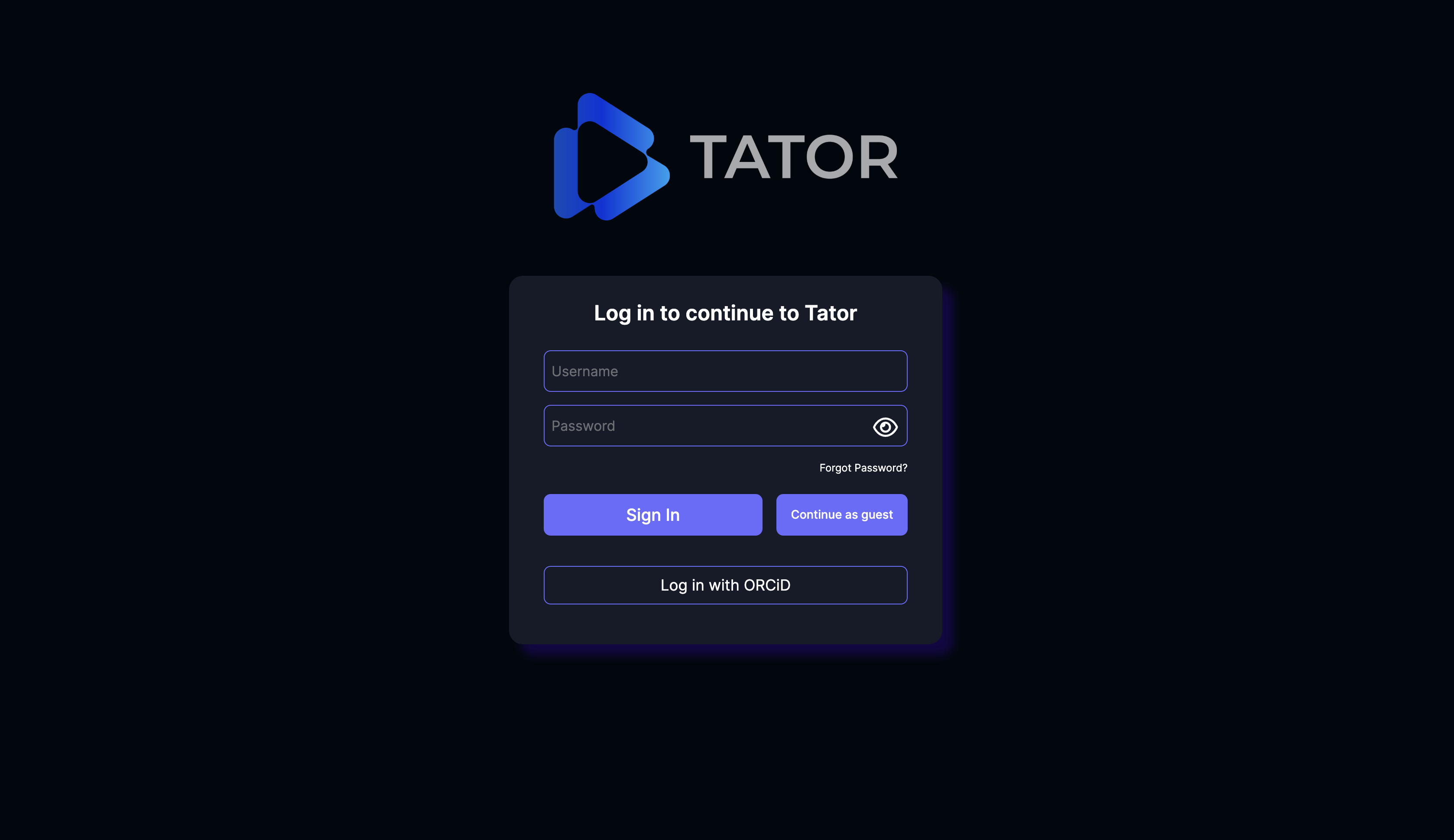 If you provided your ORCID ID, feel free to use it to login at cloud.tator.io. In the screenshot below, you will see there is a “Log in with ORCID” button, which allows you to sign into ORCID and enter through that method.